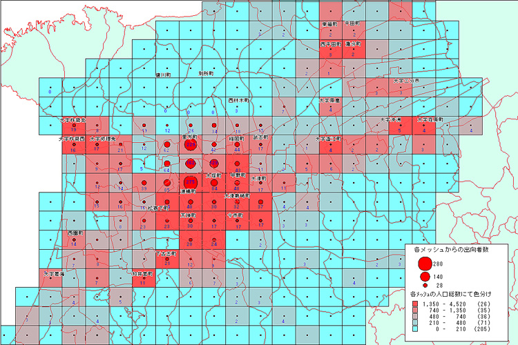 丸印は新規出店した店舗へ来るお客様の発生数を発生地別に丸の大きさで表しています。